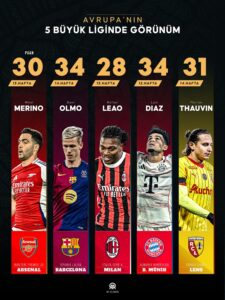 AVRUPA'NIN 5 büyük futbol ülkesi Almanya (Bundesliga), Fransa (Ligue 1), İngiltere (Premier Lig), İspanya (LaLiga) ve İtalya'daki (Serie A) maçlara hafta sonu devam edildi.Sürpriz sonuçlara sahne olan haftada 5 büyük ligin 3'ünde zirvenin sahipleri değişti.LaLiga'da Barcelona, Serie A'da Milan ve Ligue 1'de Lens, liderliğe yerleşti. Premier Lig'de Arsenal, Bundesliga'da ise Bayern Münih, zirvedeki yerini korudu.