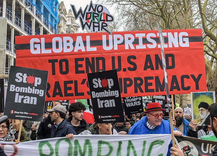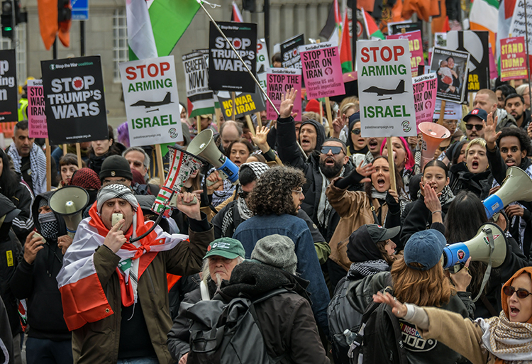 İngiltere’nin başkenti Londra’da bir araya gelen binlerce savaş karşıtı, İsrail ve ABD’nin İsrail’e yönelik hava saldırılarını protesto için ABD’nin Londra Büyükelçiliğine yürüdü