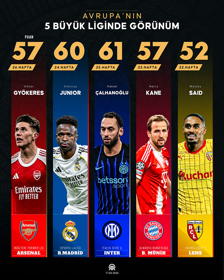 LALİGA'DA Real Madrid ve Ligue 1'de Lens liderlik koltuğuna otururken, Premier Lig'de Arsenal, Serie A'da Inter ve Bundesliga'da Bayern Münih puan tablosunun zirvesinde yer aldı.