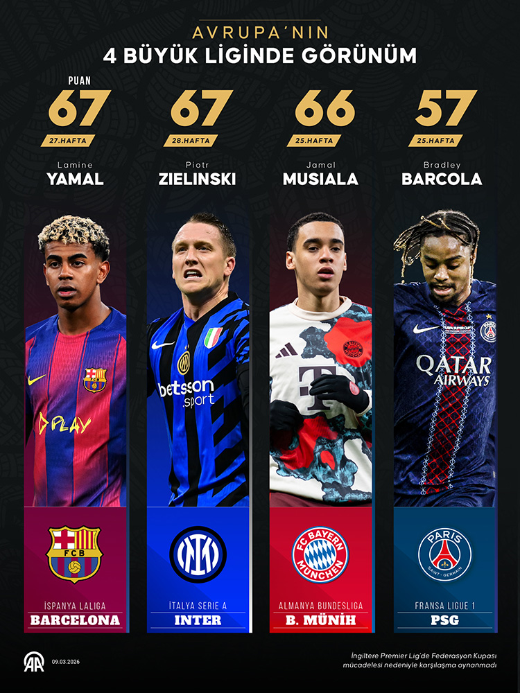 LALİGA'DA Barcelona, Serie A'da Inter, Bundesliga'da Bayern Münih, Ligue 1'de ise Paris Saint-Germain (PSG), puan tablosunun zirvesinde yer aldı.