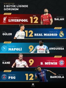 AVRUPA’NIN 5 büyük futbol ülkesi Almanya (Bundesliga), Fransa (Ligue 1), İngiltere (Premier Lig), İspanya (LaLiga) ve İtalya’daki (Serie A) maçlara hafta sonu devam edildi.Milli maç arasının sona ermesiyle futbolda lig maratonu yeniden başlarken, Avrupa’nın önemli kulüplerinde forma giyen yıldız futbolcular Hakan Çalhanoğlu, Kenan Yıldız, Arda Güler ve Can Uzun, attıkları gollerle hafta sonuna damga vurdu.İspanya’da Real Madrid, İngiltere’de Liverpool, İtalya’da Napoli, Almanya’da Bayern Münih ve Fransa’da Paris Saint-Germain (PSG), puan tablosunun zirvesinde yer aldı.