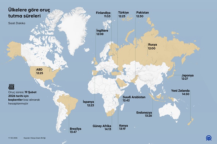 MÜSLÜMANLAR, dünya genelinde ramazan ayına 18 ya da 19 Şubat'ta başlamaya hazırlanırken oruç tutma süreleri ülkelerin konumuna göre değişecek.Dünya genelindeki 2 milyarı aşkın Müslüman için ramazandaki günlük oruç süresi, coğrafi konum ve yılın dönemine bağlı olarak değişiklik gösterirken süreler yaklaşık 12 ila 15 saat şeklinde seyredecek.