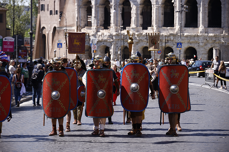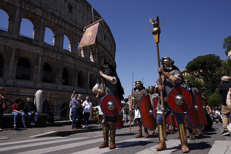 Roma'nın 2 bin 779'uncu doğum günü için düzenlenen etkinlikle, Roma İmparatorluğu döneminin askerlerinin, lejyonerlerinin, senatörlerinin ve Romalıların kıyafetlerini giyen figüranlar kent merkezinde yürüyüş yaptı.