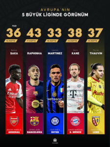 AVRUPA’NIN 5 büyük futbol ülkesi Almanya (Bundesliga), Fransa (Ligue 1), İngiltere (Premier Lig), İspanya (LaLiga) ve İtalya’daki (Serie A) maçlara hafta sonu devam edildi.Serie A’da Inter, LaLiga’da Barcelona, Premier Lig’de Arsenal, Bundesliga’da Bayern Münih, Ligue 1’de ise Lens, puan tablosunun zirvesinde yer aldı.