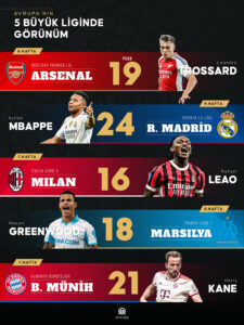 AVRUPA’NIN 5 büyük futbol ülkesi Almanya (Bundesliga), Fransa (Ligue 1), İngiltere (Premier Lig), İspanya (LaLiga) ve İtalya’daki (Serie A) maçlara hafta sonu devam edildi.İspanya’da Real Madrid, İngiltere’de Arsenal, İtalya’da Milan, Almanya’da Bayern Münih ve Fransa’da Marsilya, puan tablosunun zirvesinde yer aldı.