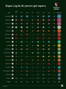 Süper Lig'de geride kalan 17 haftada takımlar 398 kez gol sevinci yaşadı.Ligin ilk bölümünde lider Galatasaray ve takipçisi Fenerbahçe, 39'ar golle rakip fileleri en çok havalandıran ekipler oldu.Trabzonspor 33, Beşiktaş 30, Başakşehir 27, Gaziantep FK 24, Samsunspor 22, Göztepe, Gençlerbirliği ve Konyaspor 21, Çaykur Rizespor 20, Corendon Alanyaspor, Antalyaspor ve Kayserispor 16, Kocaelispor 15, Kasımpaşa ve Fatih Karagümrük ise 14 kez gol üretti.Süper Lig'de ilk 17 haftada en az gol sevinci yaşayan ekip ise 10 golle Eyüpspor oldu.